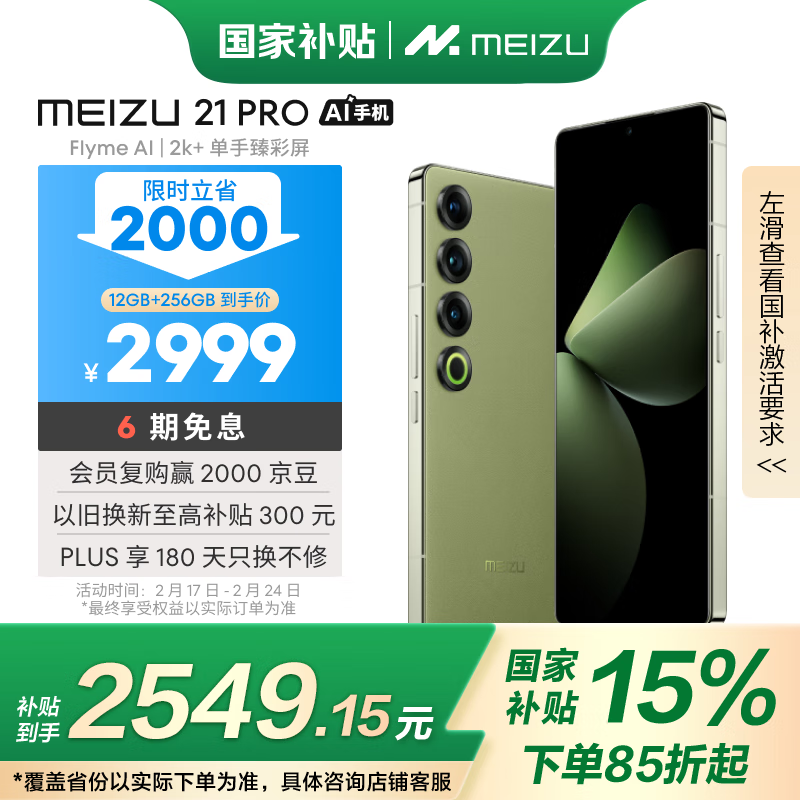 魅族(MEIZU)21 PRO AI旗舰手机 12GB+256GB 月桂绿 2k+臻彩屏 5000万超稳AI影像 第三代骁龙8 政府补贴价格:3099.00元!