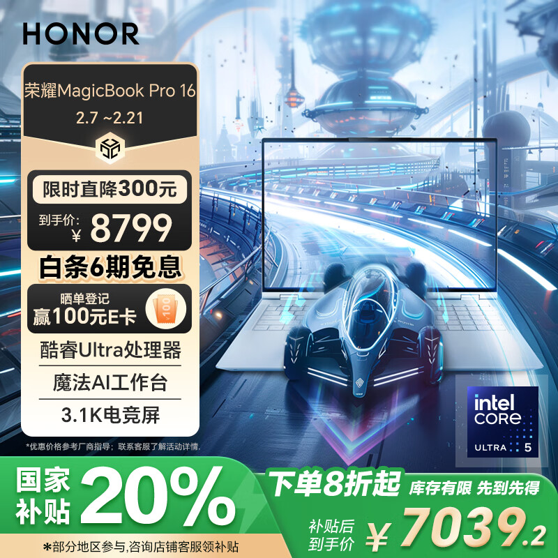 荣耀MagicBook Pro16HUNTER版【政府补贴20%】AI游戏本酷睿Ultra5 24+1T RTX4060 3K电竞屏 云霓色价格:8799.00元!