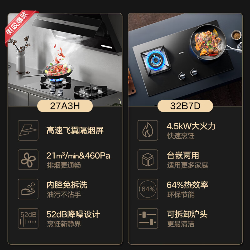 老板(Robam)抽油烟机烟灶套装免拆洗侧吸油烟机燃气灶家用吸油烟机灶具27A3H+32B7D套装(天然气)价格:3098.00元!