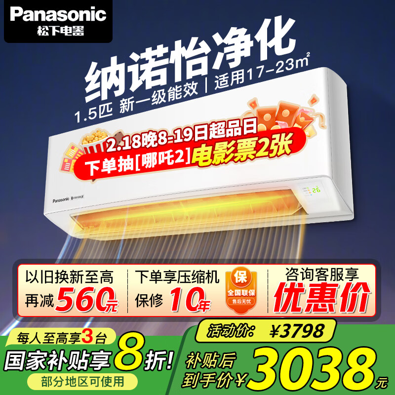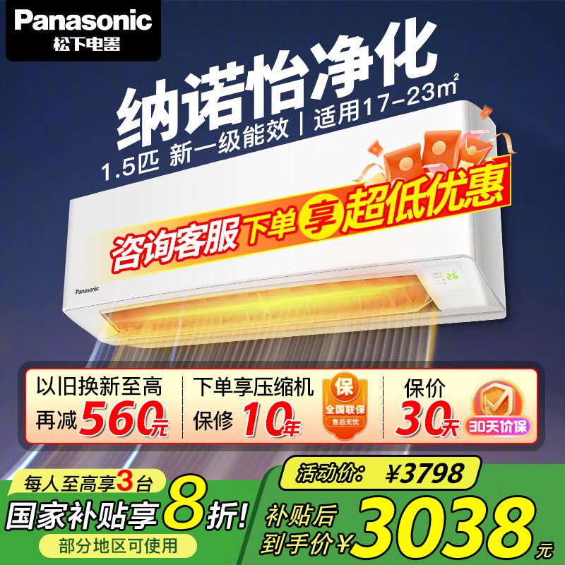 松下(Panasonic)空调1.5匹新一级能效变频冷暖壁挂式空调挂机 纳诺怡除菌KFR-35GW/BpZY410 以旧换新家电补贴价格:3798.00元!
