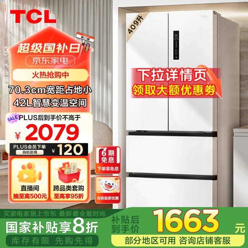 TCL 409升白色法式多门四开门对开门家用电冰箱风冷无霜一级能效双变频补贴以旧换新R409V5-D价格:2199.00元!