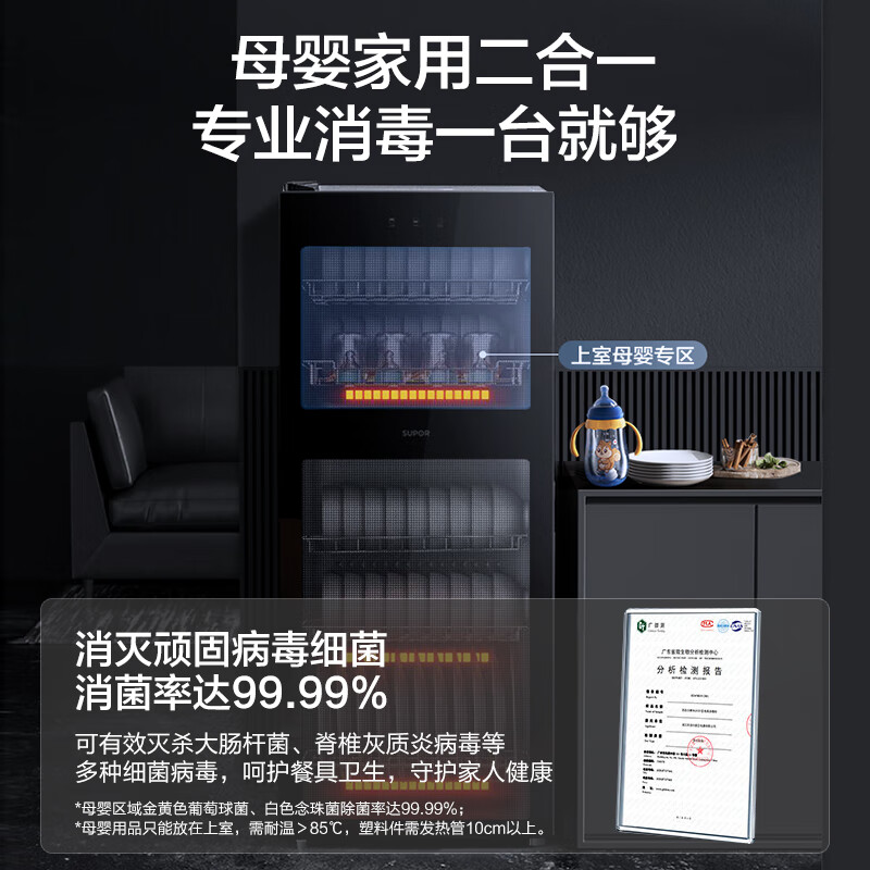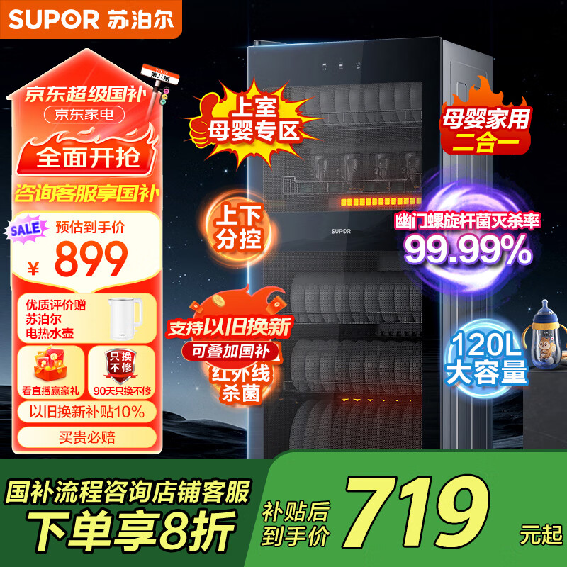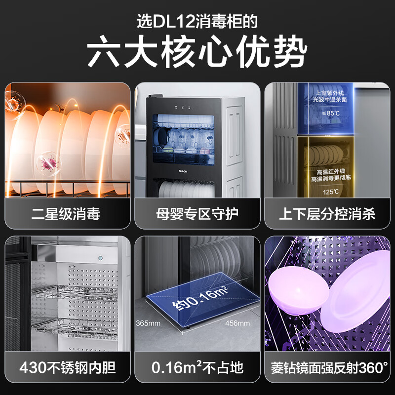 苏泊尔(SUPOR)消毒柜家用 立式120L容量 430不锈钢内胆 上室母婴专区紫外线杀菌 RLD120-DL12价格:899.00元!