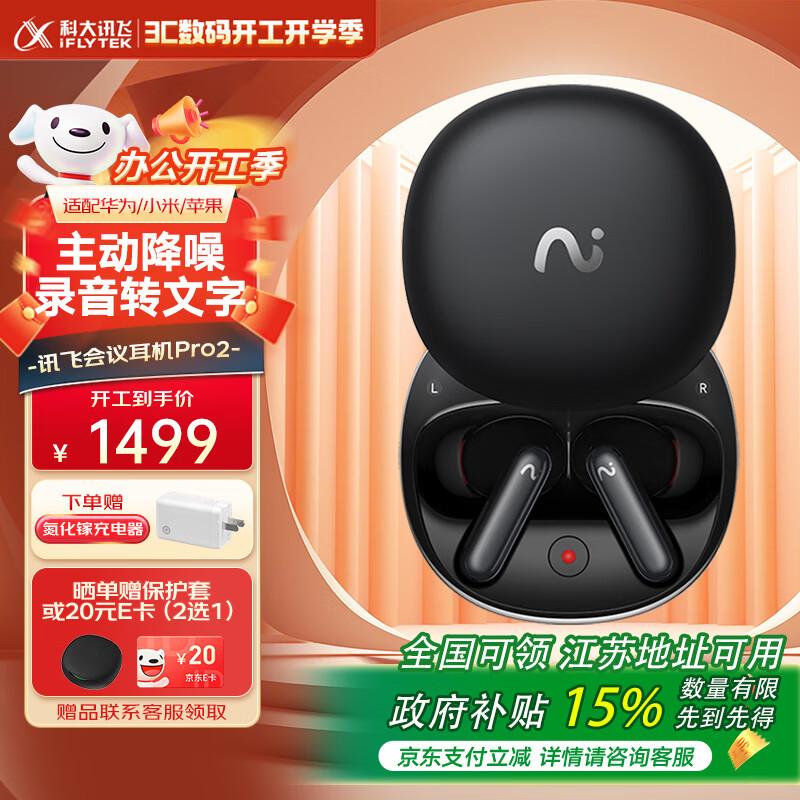 科大讯飞录音降噪会议蓝牙耳机Pro2 AI会议助理 同传翻译 主动降噪 政府补贴【夜影黑】适配苹果华为小米价格:1499.00元!