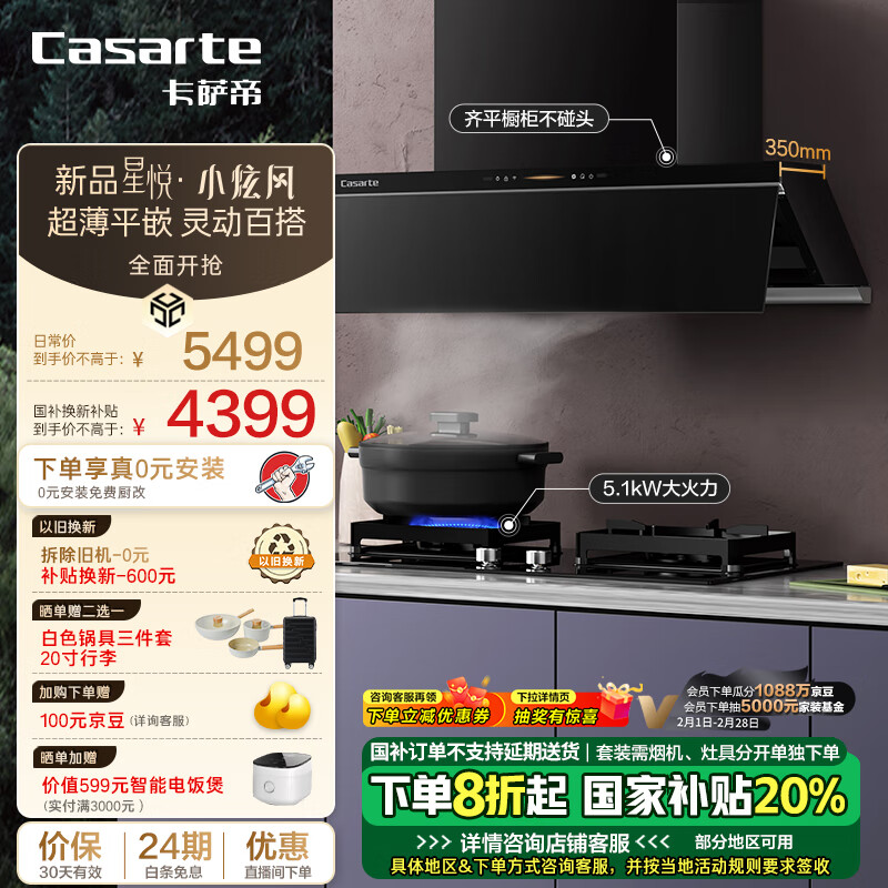 卡萨帝(Casarte)星悦小炫风抽油烟机 超薄平嵌侧吸油烟机套装 燃气灶 26风量 补贴20% CDY3UD【以旧换新】价格:6110.00元!