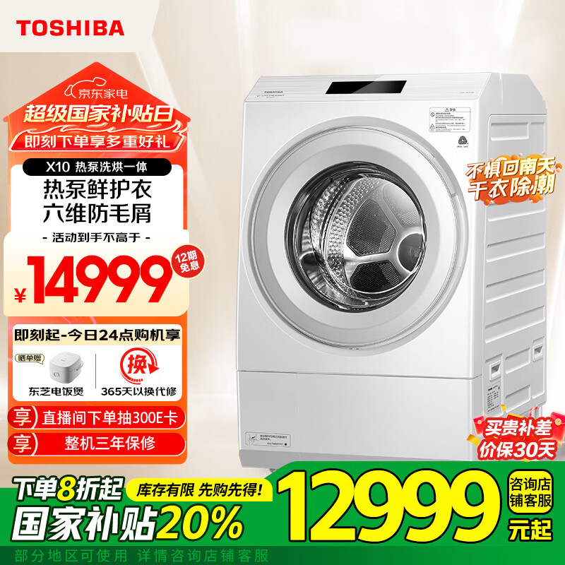 东芝(TOSHIBA)滚筒洗衣机全自动家用 x10热泵式洗烘一体机 DGH-127X10D 12公斤大容量 以旧换新 家电补贴20%价格:14999.00元!