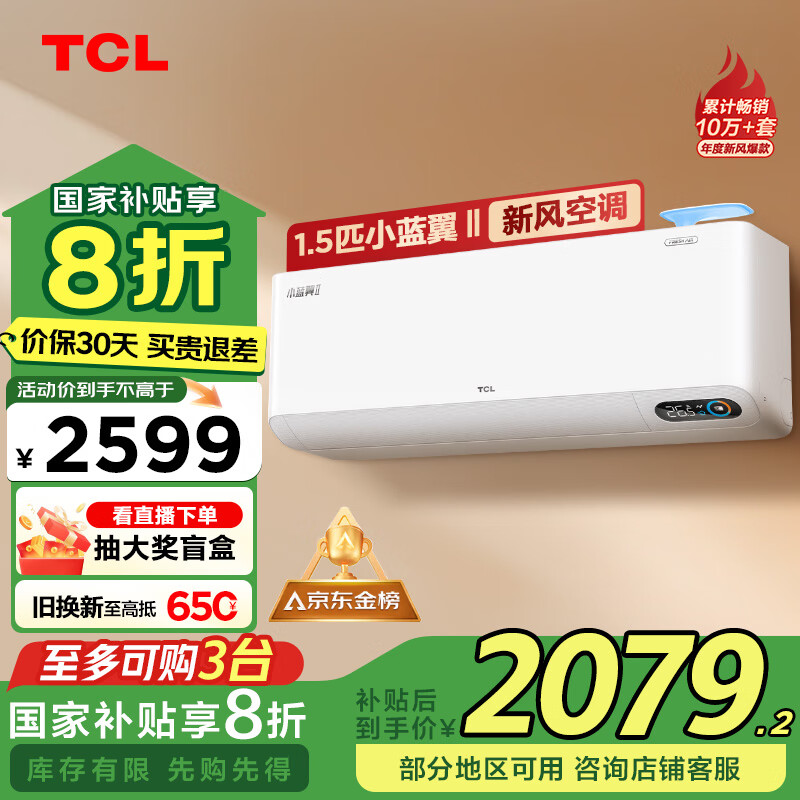 TCL新风空调1.5匹新一级 冷暖60m3/h大新风量小蓝翼Ⅱ空调挂机KFRd-35GW/D-SWA11Bp(B1)以旧换新补贴价格:2599.00元!