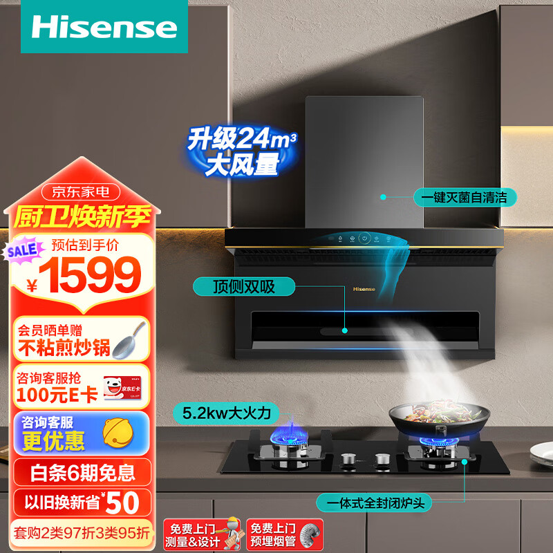 海信(Hisense)超薄平嵌顶侧双吸24立方大吸力挥手智控自清洁家用脱排抽油烟机净魔方烟灶套装DS11H+DB31以旧换新价格:1899.00元!