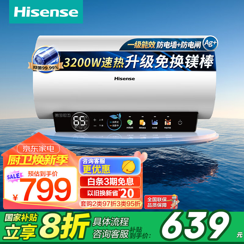 海信(Hisense)60升家用电热水器3200W大功率8倍增容钻石无缝胆免换镁棒一级能效双重防电ES60-C301i补贴20%价格:799.00元!