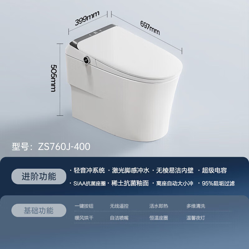 4、这款zs760J智能马桶外形灵巧、瓷釉细腻、经济实惠、功能多多,会带给你全新的体验,小夜灯温馨的蓝光会伴随你拥有美丽的舒适心情,买了这款,我觉得我的选择是非常正确的!