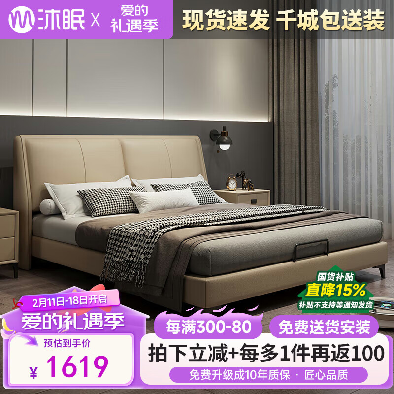 沐眠轻奢皮艺双人床现代简约卧室新款皮床C-F01 1.8米20CM浅卡其色价格:2099.00元!
