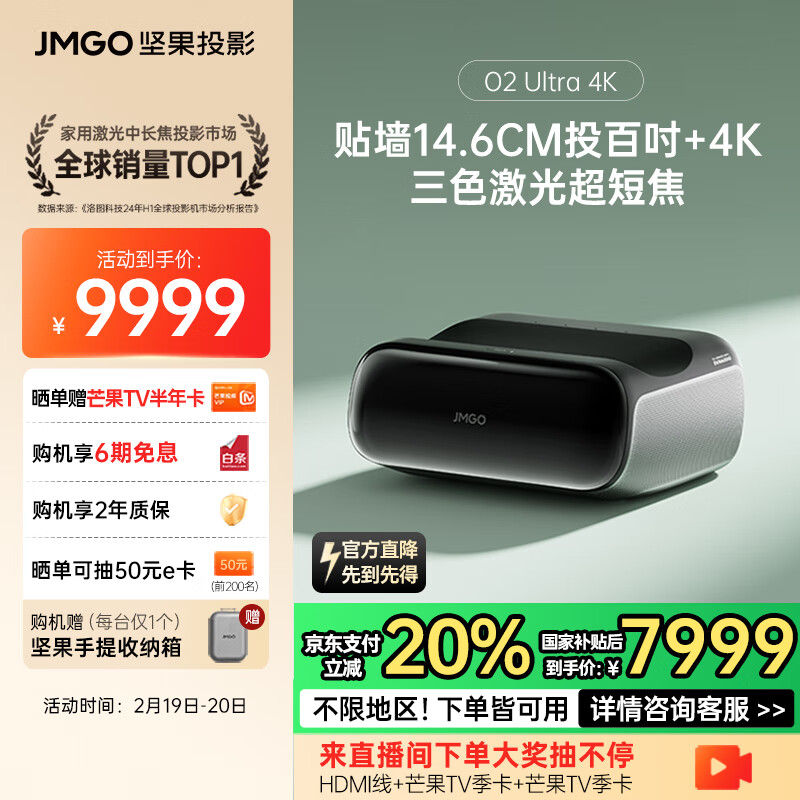 坚果投影(JMGO)O2 Ultra 4K超高清超短焦激光电视纯三色激光投影仪家用影院(2800:1对比度|电动微云台 )价格:9999.00元!