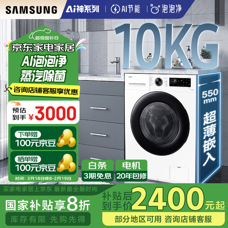 三星(SAMSUNG)AI神洗衣机5系10KG全自动滚筒AI泡泡净蒸汽除菌大桶径设计以旧换新补贴白WW10DG5U24AWSC价格:5999.00元!