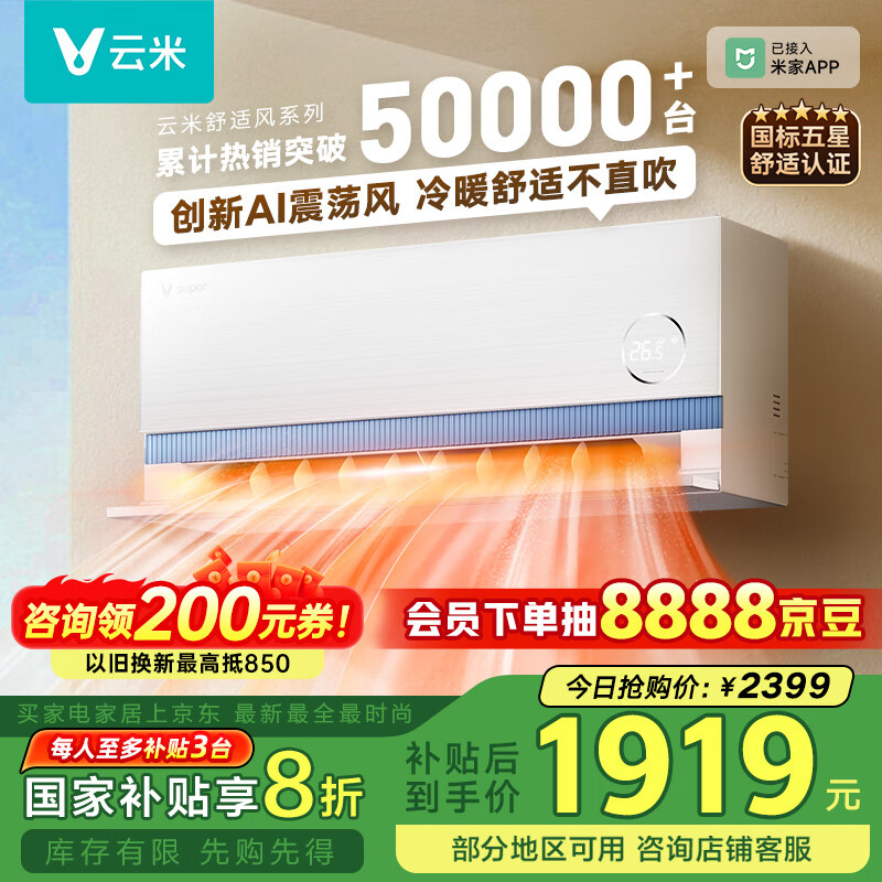 云米(VIOMI)米家APP 空调1.5匹 变频冷暖 Super 3新一级AI全域风 家电补贴省电挂机KFRd-35GW/Y3DY1-A1价格:2599.00元!