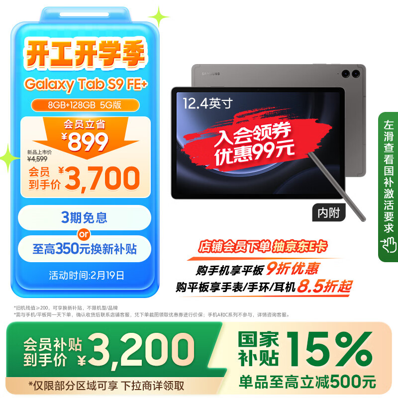 三星 Samsung【政府补贴】S9 FE+ 12.4英寸平板电脑/护眼大屏/IP68防水/含S Pen 8+128GB 石墨灰5G价格:3799.00元!