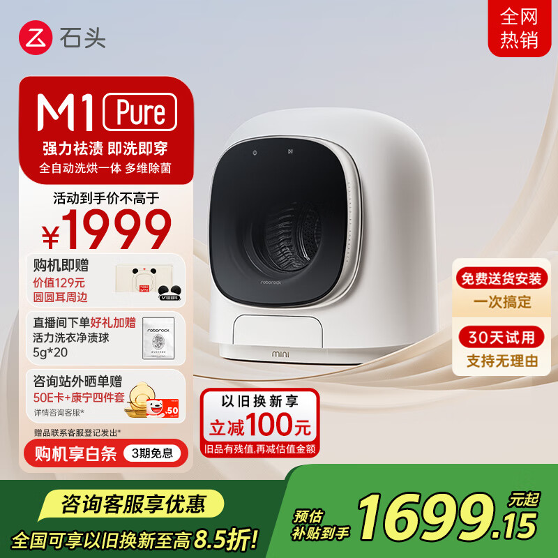 石头迷你洗烘一体机M1 Pure 1KG大容量迷你全自动内衣洗衣机 UVC除菌 夜间托管 智能投放 补贴价格:1999.00元!