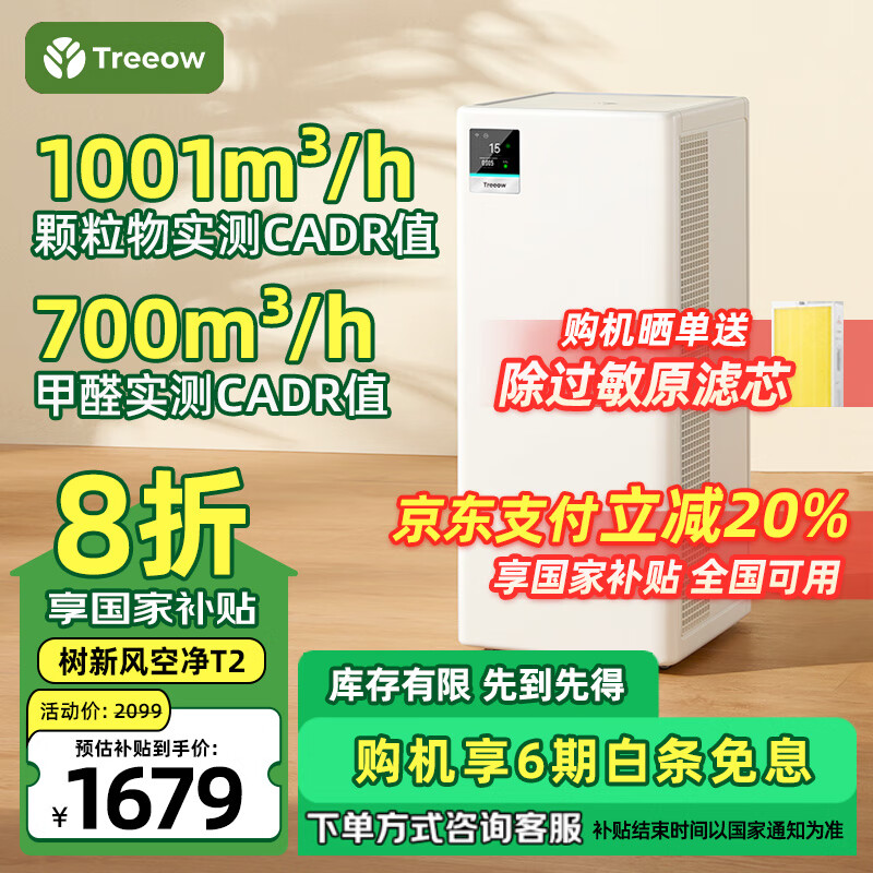 树新风空气净化器 除甲醛异味雾霾流感除菌除过敏认证 家用大空间 净化 T2【家电补贴】价格:2099.00元!