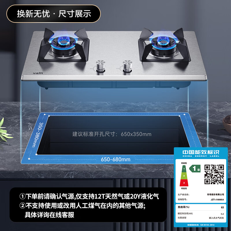 华帝(VATTI)政府补贴官方家用不锈钢燃气灶天然气灶嵌入式双灶5.0kW猛火一级能效灶具灶台以旧换新i10065A价格:999.00元!