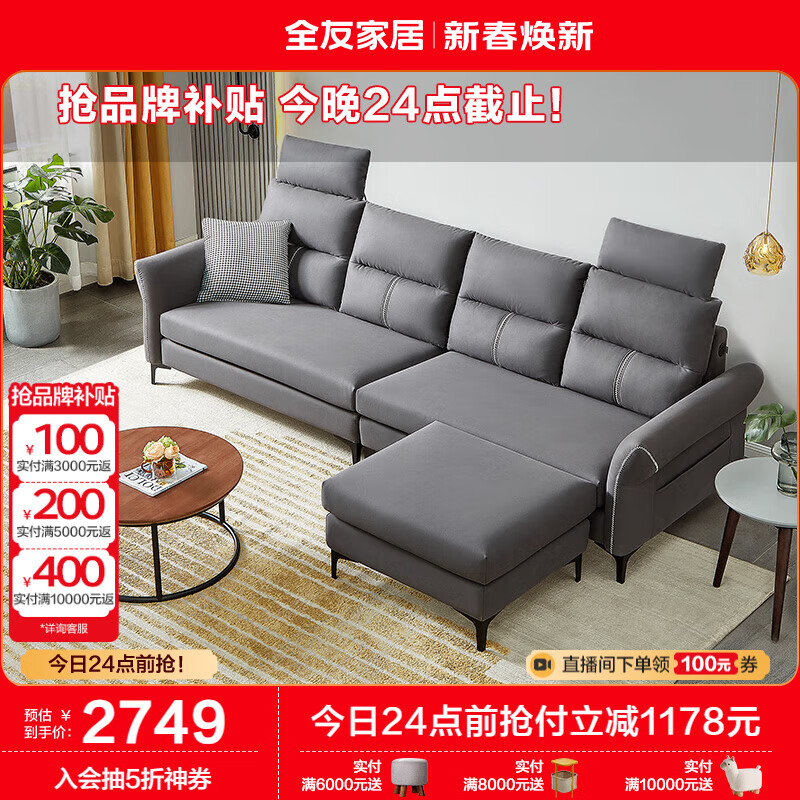 全友家居 现代简约功能科技布艺可拆洗储物小户型直排沙发客厅102679价格:3927.14元!