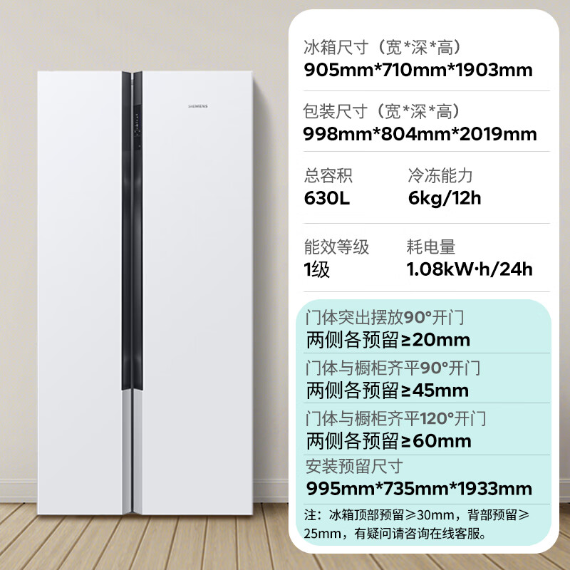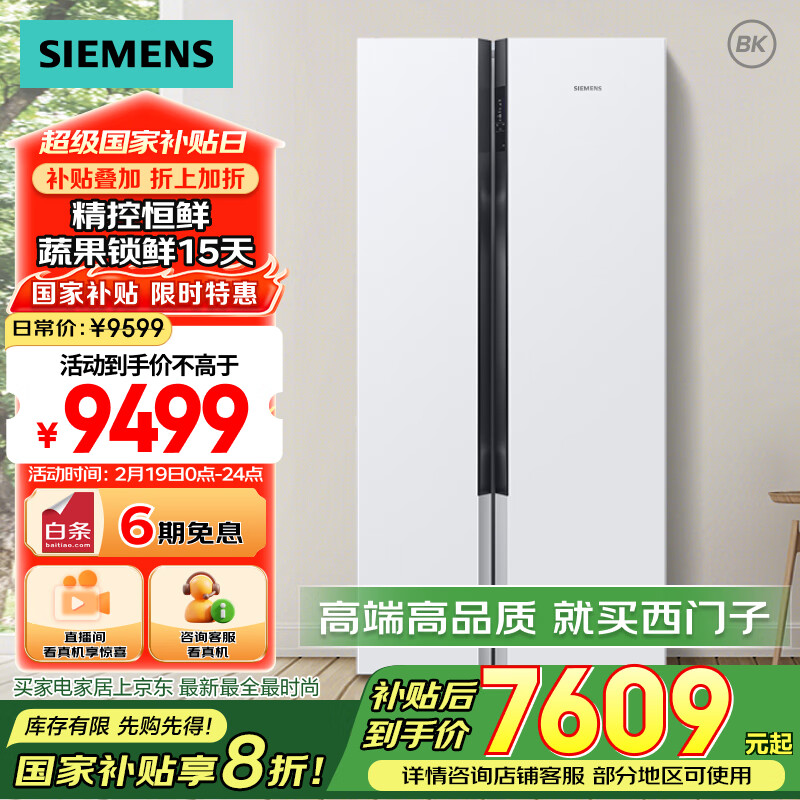 西门子(SIEMENS)630升对开门变频风冷无霜家用冰箱 精控恒鲜 家电补贴 双开门 大容量 一级能效白色KX63EA20TI价格:9999.00元!
