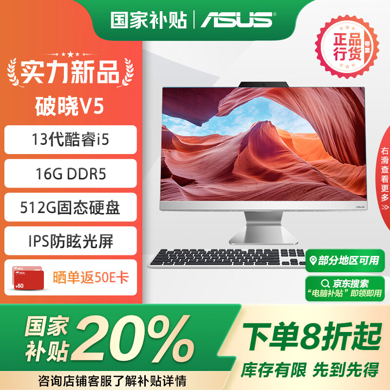 华硕破晓V5 2024 23.8英寸一体机台式电脑 补贴(13代i5-1335U 16G DDR5 512G SSD WiFi6 蓝牙)白价格:3999.00元!