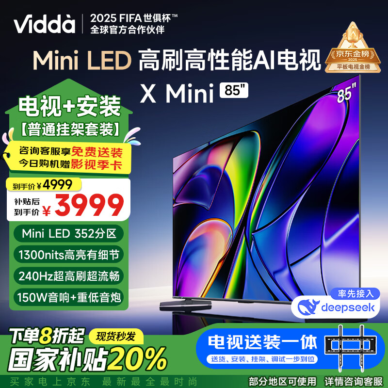 Vidda X Mini 85英寸【送装一体版】海信电视 Mini LED DeepSeek 一级能效以旧换新补贴游戏液晶电视价格:4799.00元!