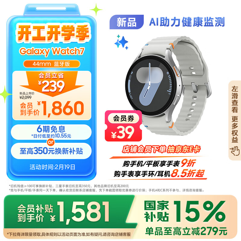 三星 Samsung【政府补贴】Watch7 智能手表/蓝牙通话/运动手表/电话手表 44mm 幻羽银 男女表价格:1899.00元!
