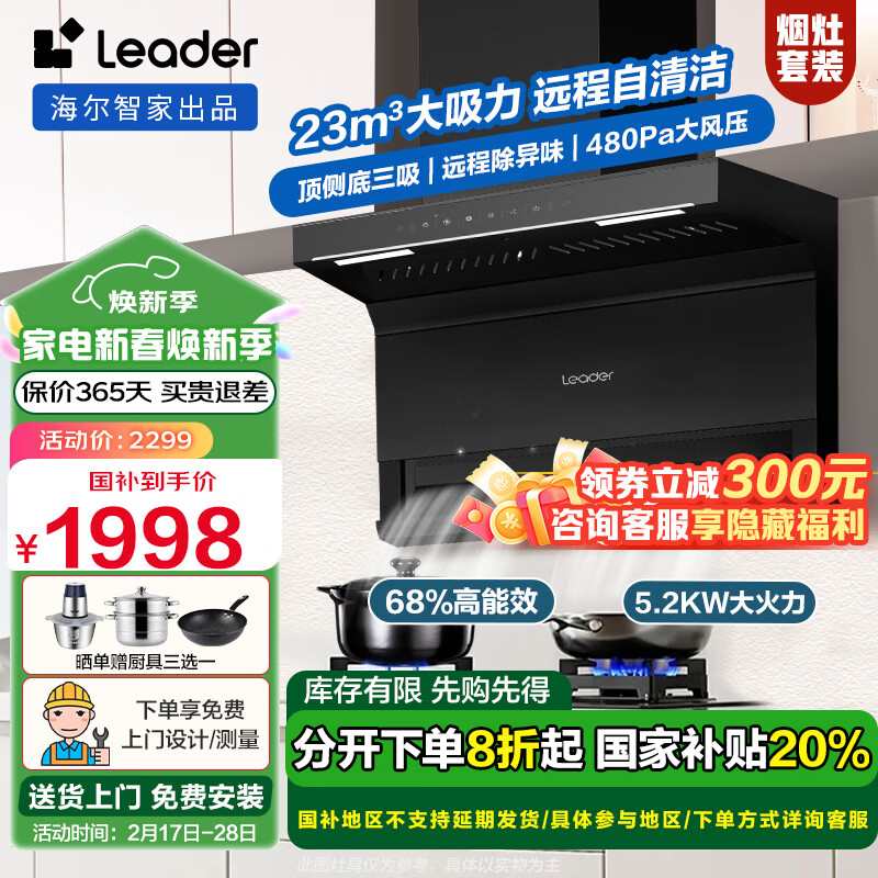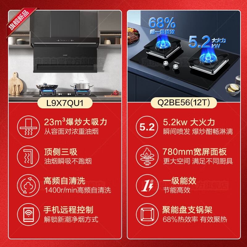 海尔(Haier)智家出品抽油烟机燃气灶套装 挥手智控 7字型23立方吸脱排油烟机L9X7QU1+5.2KW灶Q2BE56灶具价格:2599.00元!