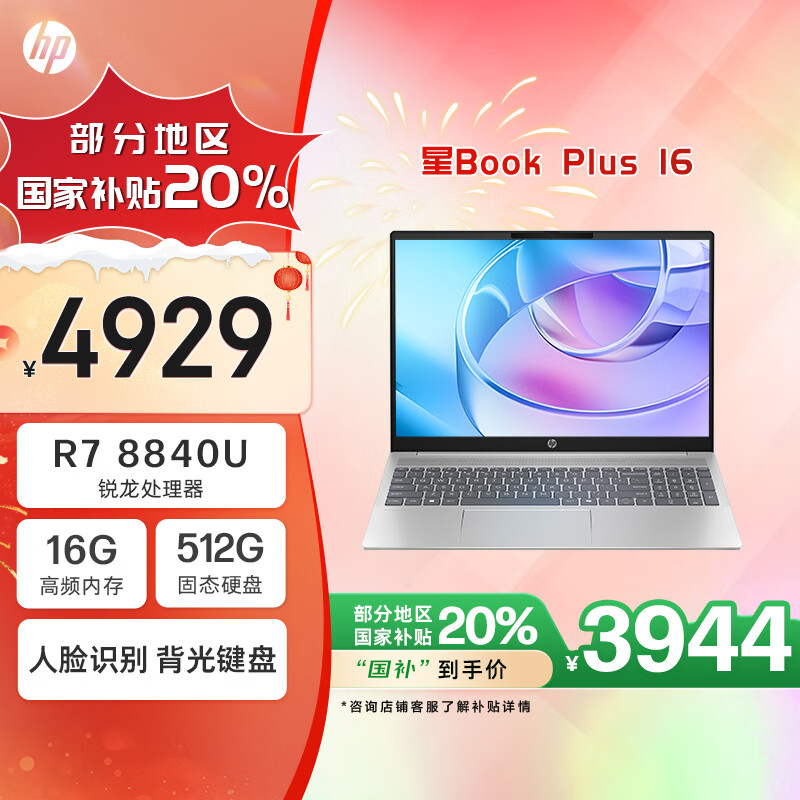 惠普HP【补贴20%】星Book Plus 16 大屏轻薄笔记本电脑(R7-8840U 16G 512G 人脸识别 背光键盘)银价格:4929.00元!