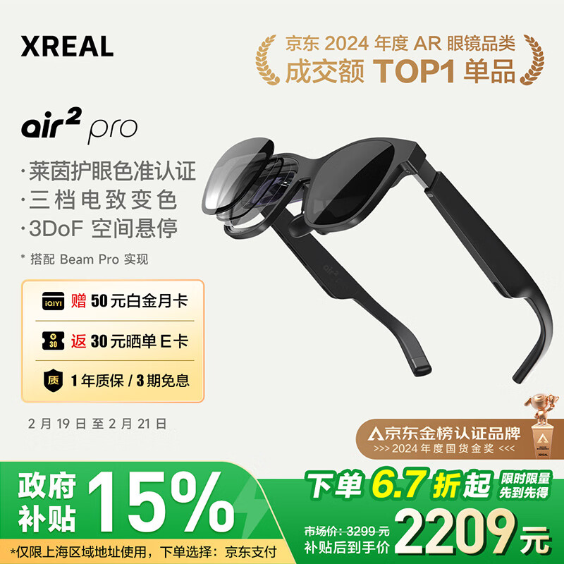 XREAL Air 2 Pro智能AR眼镜 电致变色 DP直连苹果16系列 非VRAI眼镜 同vision pro投屏体验 翻译软件价格:2599.00元!