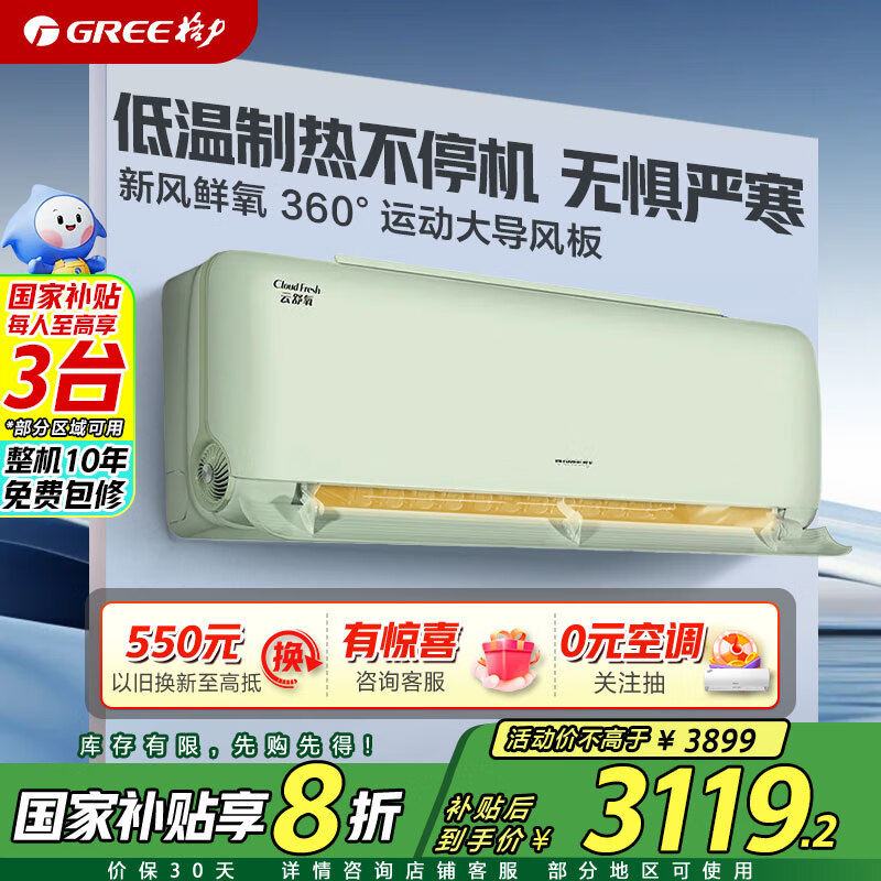 格力(GREE)新风空调 大1匹 云舒氧 壁挂式卧室挂机 格力空调KFR-26GW/NhHg1BAj(豆蔻绿) 以旧换新补贴价格:3899.00元!
