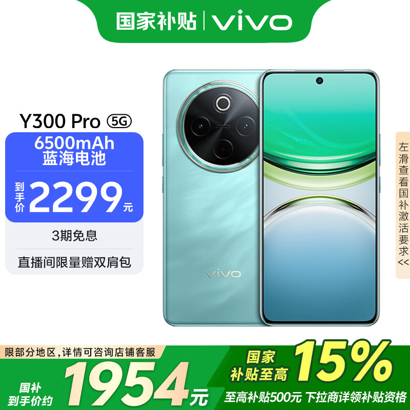 vivo Y300 Pro 12GB+512GB 金镶玉 补贴 6500mAh超薄蓝海电池 全等深微四曲屏 AI 拍照 手机价格:2299.00元!