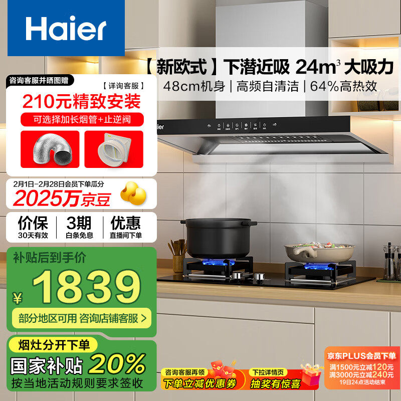 海尔(Haier)抽油烟机 油烟机燃气灶套装【山茶花】深潜近吸24大吸力 5.2kw火力 政府补贴20%油烟机906S+BE6天价格:2299.00元!