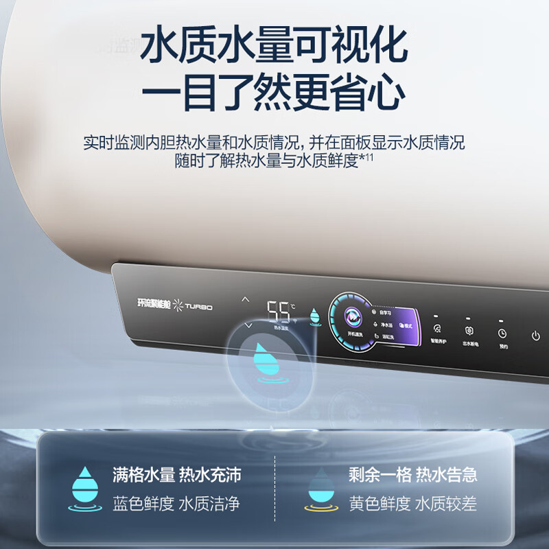 1、外形外观:酷炫有型,简洁大方加热速度:几分钟可以出温水啦,夏天洗温水没问题的耗能情况:一级能效,规矩洗浴时间:60升全部加热断电6月的天气一个人可以用好多天,保温效果杠杠。其他特色:有遥控,很方便,手机还可以控制,相当巴适。