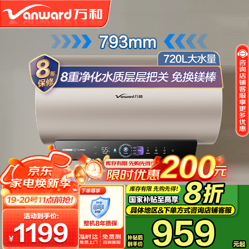 万和(Vanward)矿泉浴R8【补贴20%】60升电热水器3300W变频节能 免换镁棒 超一级能效抑菌E60-R8D1-30价格:1298.00元!