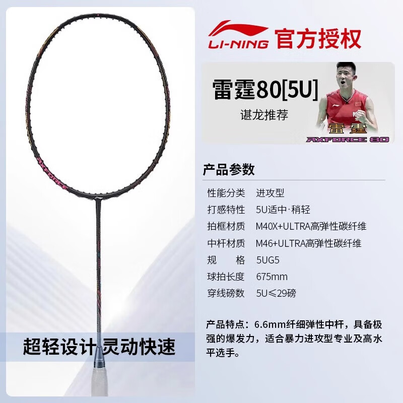 李宁(LI-NING)羽毛球拍雷霆80全碳素谌龙战拍进攻型黑金配色高端球拍 5U空拍价格:1229.00元!
