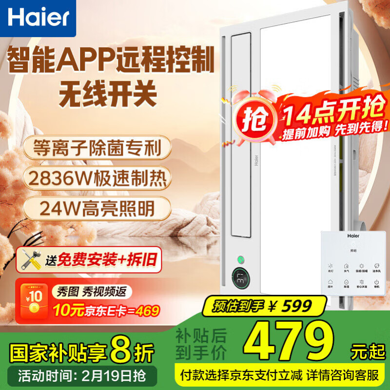 海尔智能风暖浴霸暖风照明排气一体卫生间暖风机浴室集成吊顶HD28U1价格:599.00元!