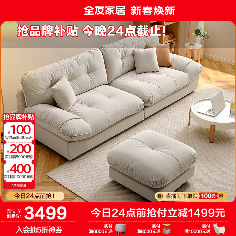 全友家居 奶油风布艺沙发客厅小户型直排防猫抓布云朵沙发卧室111039价格:4998.57元!