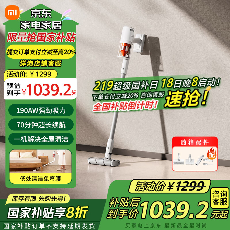 米家 小米无线吸尘器2Pro 家用吸尘器无线手持大吸力 深层除尘除螨吸拖一体 多功能弯折管70分钟长续航价格:1299.00元!