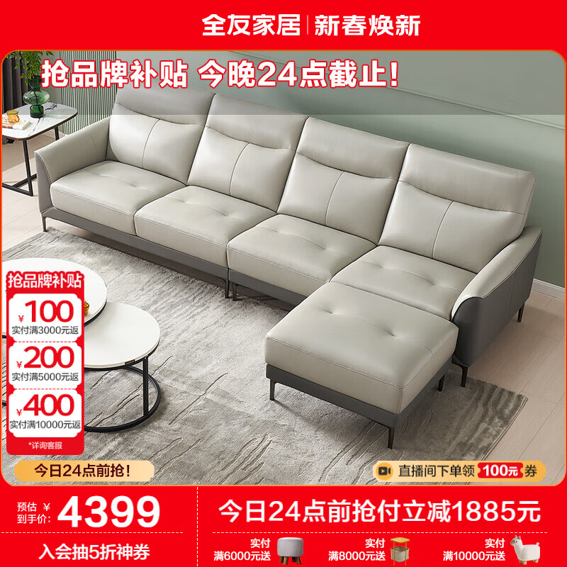 全友家居 真皮沙发 现代简约小户型头层牛皮轻奢直排式沙发客厅102710价格:6284.29元!