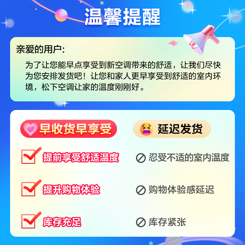 1、虽然买的人多送货慢了些,不过安装还是很准时。空调初步用下来不错,新一级能耗,噪音也很低。外观个人觉得还行,有松下的味道。安装不错,收费很低。