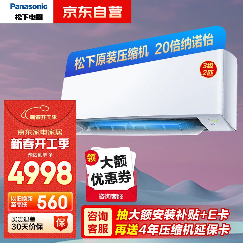 松下(Panasonic)空调滢风升级款 2匹 新三级能效 变频冷暖挂机 原装压缩机 ZY50K430 以旧换新价格:4998.00元!