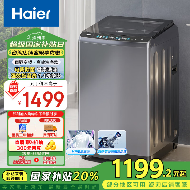 海尔(Haier)波轮洗衣机全自动家用 10公斤大容量 直驱变频一级能效 漩瀑洗 以旧换新Mate3家电补贴价格:1499.00元!