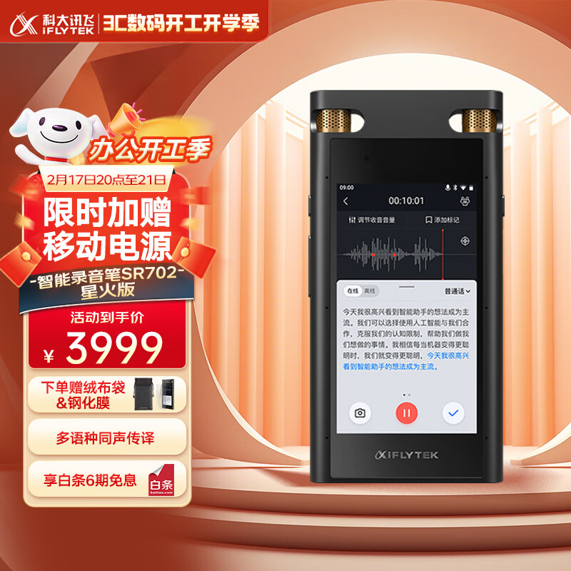 科大讯飞AI录音笔SR702星火版 免费录音转文字 智能降噪录音神器 专业录音设备录音机 多语种同声传译价格:3999.00元!