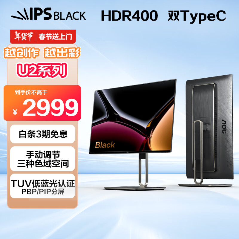 AOC 27英寸 4K Nano IPS Black屏 TUV低蓝光 HDR400 Type-C90W菊花链 电脑显示器 U27U2DP Ultra价格:2999.00元!