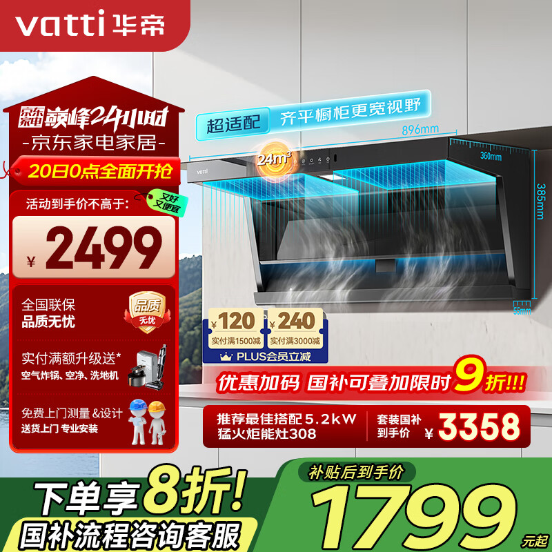 华帝(VATTI)【小飞翼】政府补贴20%超薄平嵌脱排抽油烟机K6变频顶侧双吸7字型小黑翼 24风量大吸力 i11236价格:2499.00元!