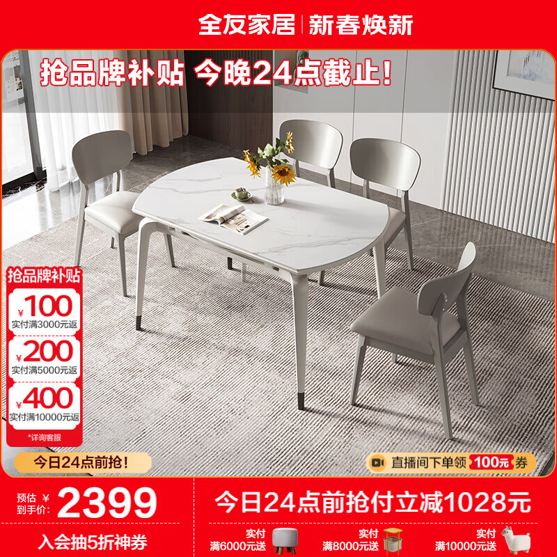 全友家居 岩板可伸缩多功能方圆两用餐桌椅组合家用客厅吃饭桌DW1121价格:3427.14元!