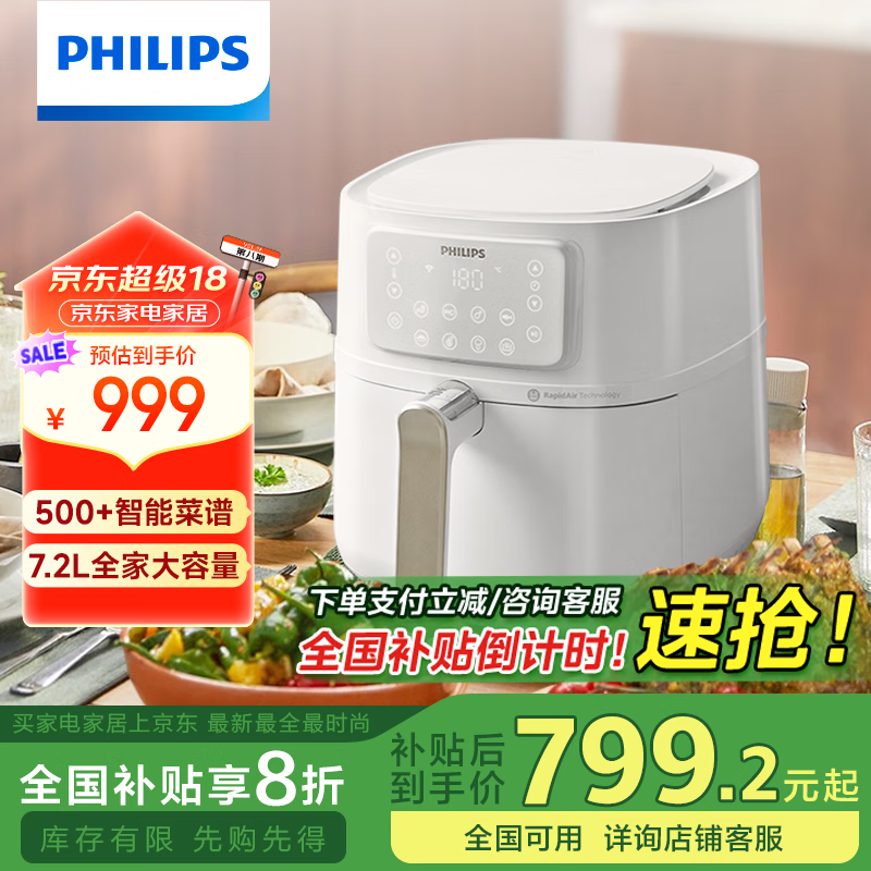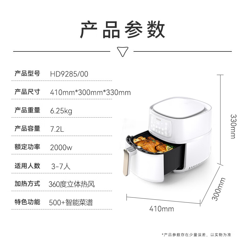 飞利浦(PHILIPS)【补贴】全新智控空气炸锅 7.2L大容量智能烹饪 精准控温不用翻面 APP菜谱 HD9285价格:999.00元!