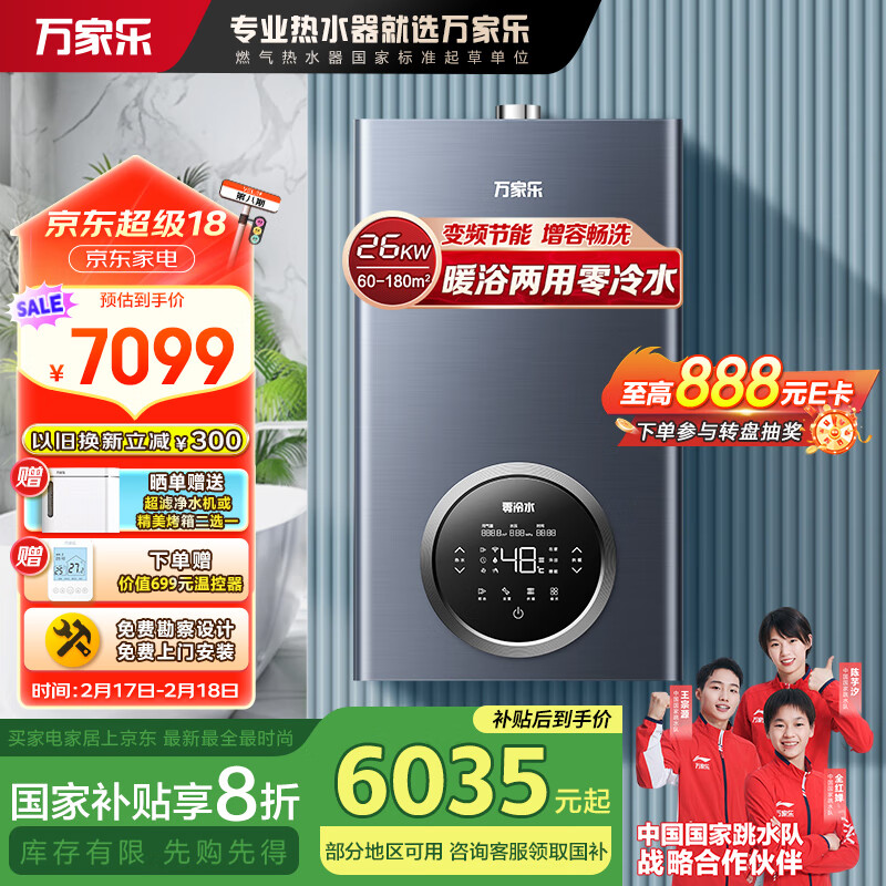 万家乐双变频零冷水壁挂炉洗浴采暖两用燃气热水器暖气片地暖增容恒温26KW天然气L1PB26-24R5L价格:7099.00元!