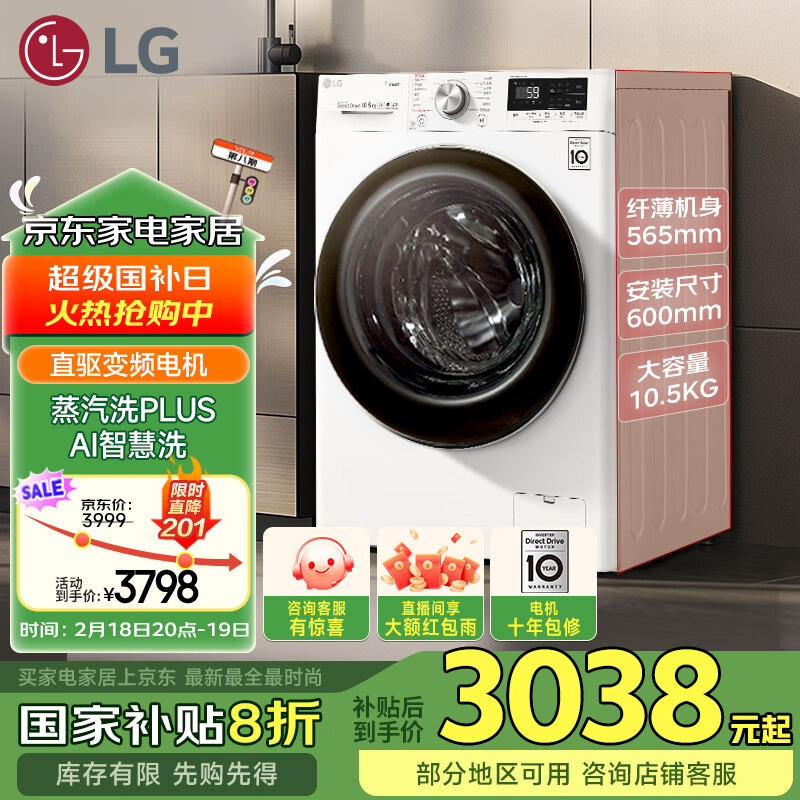 LG10.5KG超薄全自动滚筒洗衣机家用 蒸汽除菌智能手洗 565mm超薄机身 白 FLW10G4W 补贴以旧换新价格:3798.00元!