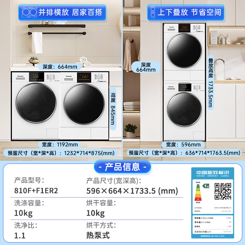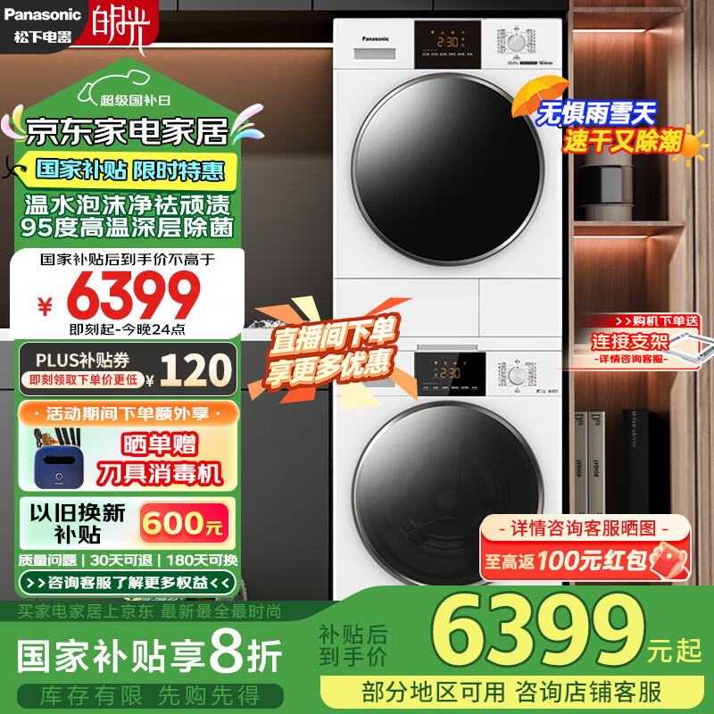 松下(Panasonic)洗烘套装 白月光轻享版 10kg滚筒洗衣机+热泵烘干机 变频压缩机 除毛烘 810F+F1ER2 补贴换新价格:7999.00元!